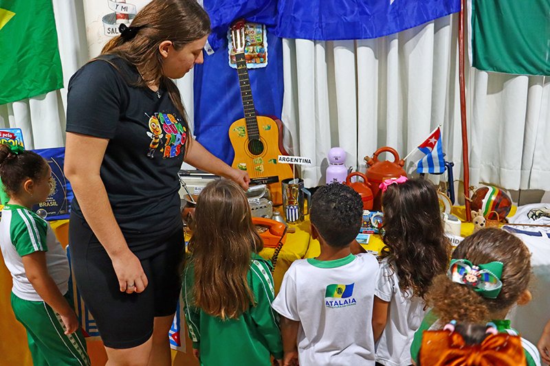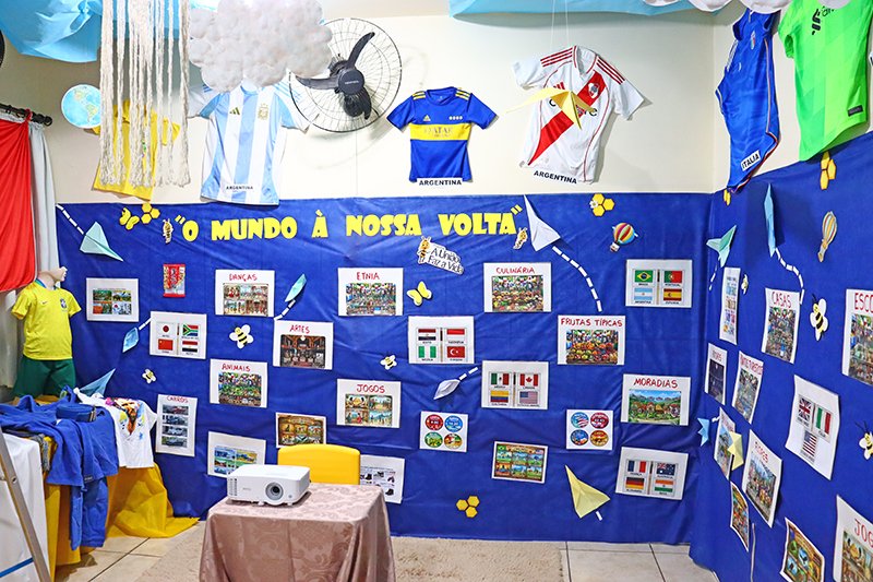 Com o apoio e auxílio da nossa comunidade, organizamos um espaço temático muito especial, onde as crianças puderam explorar e vivenciar uma grande variedade de artefatos, utensílios e elementos que representam a diversidade cultural ao redor do mundo. Além disso, assistiram a um pequeno vídeo com curiosidades sobre alguns países, ampliando ainda mais seus conhecimentos.