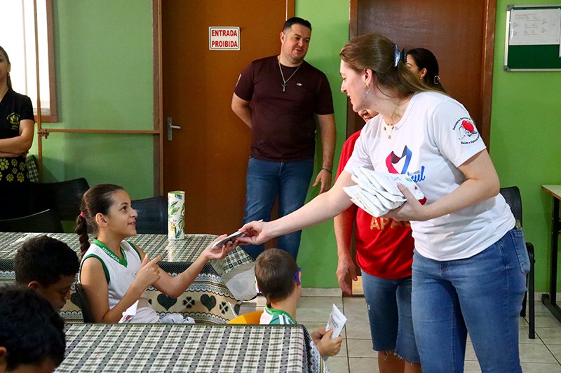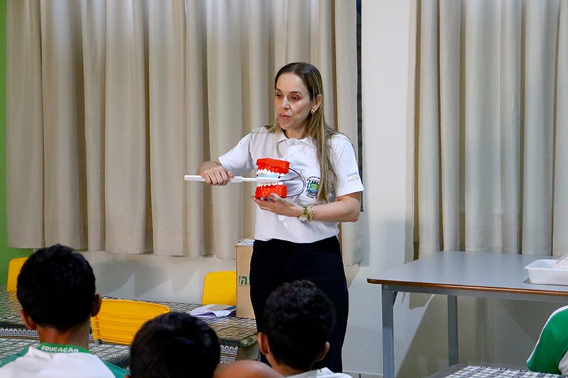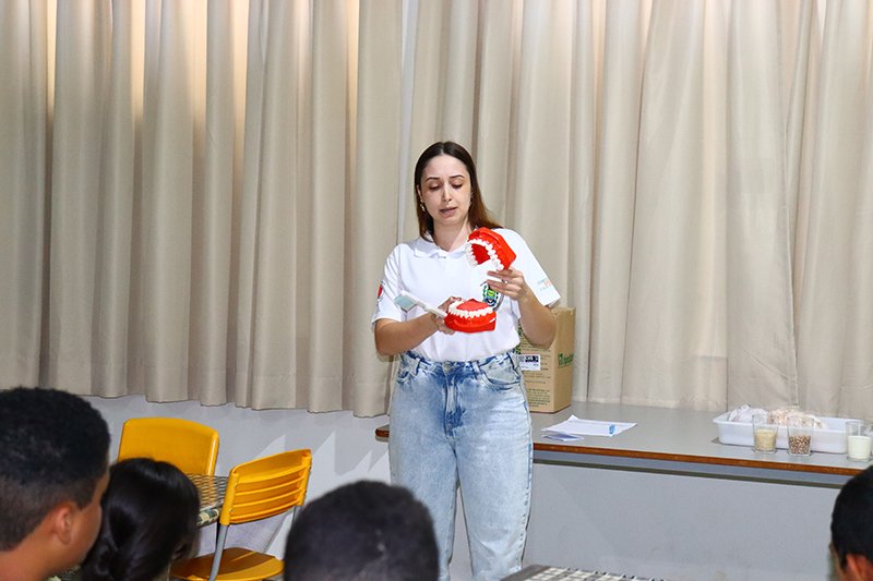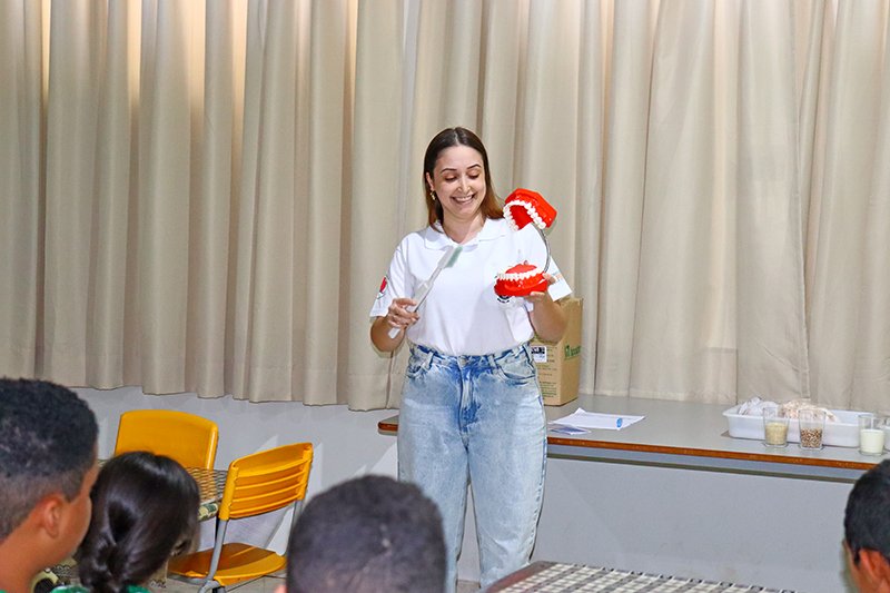 Aproveitando a reunião com os alunos, as dentistas explicaram aos alunos a forma correta da escovação dos dentes, da importância e a maneira correta de usar o fio dental, e também entregaram a todos eles os kits odontológicos compostos por escova, creme e fio dental.